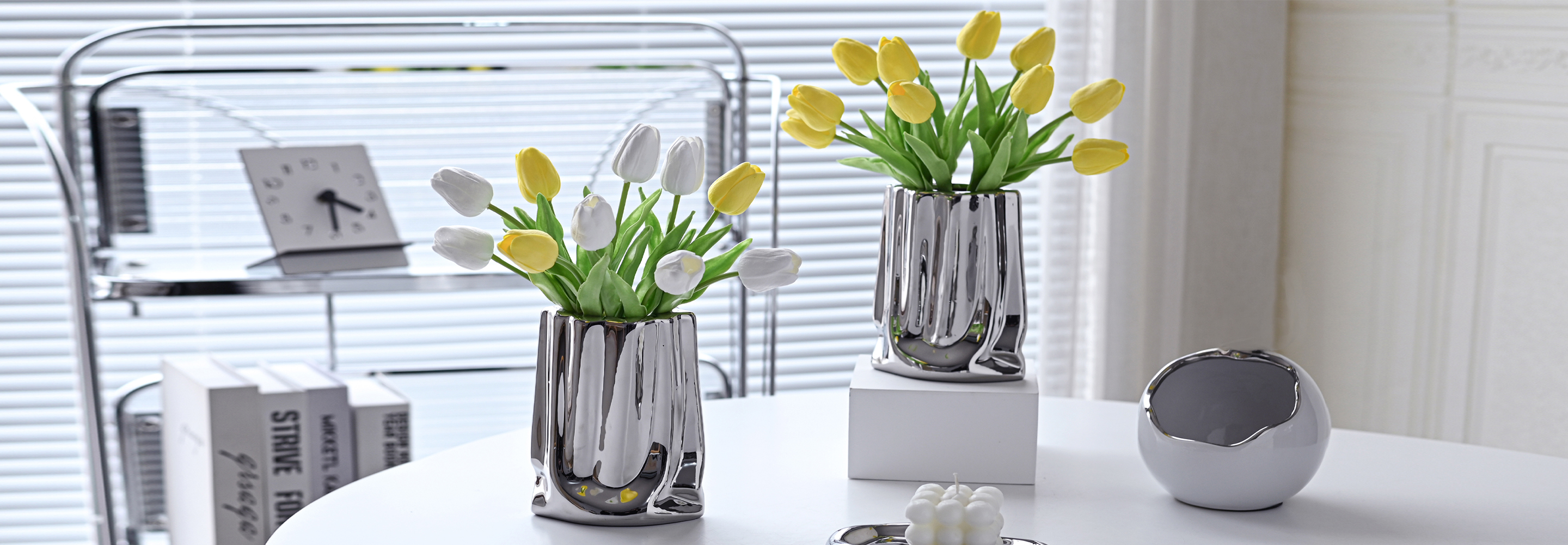 The Electroplated Silver Vase brings a unique style to your home. The interesting silhouette and metallic sheen add visual interest and can elevate your overall décor.